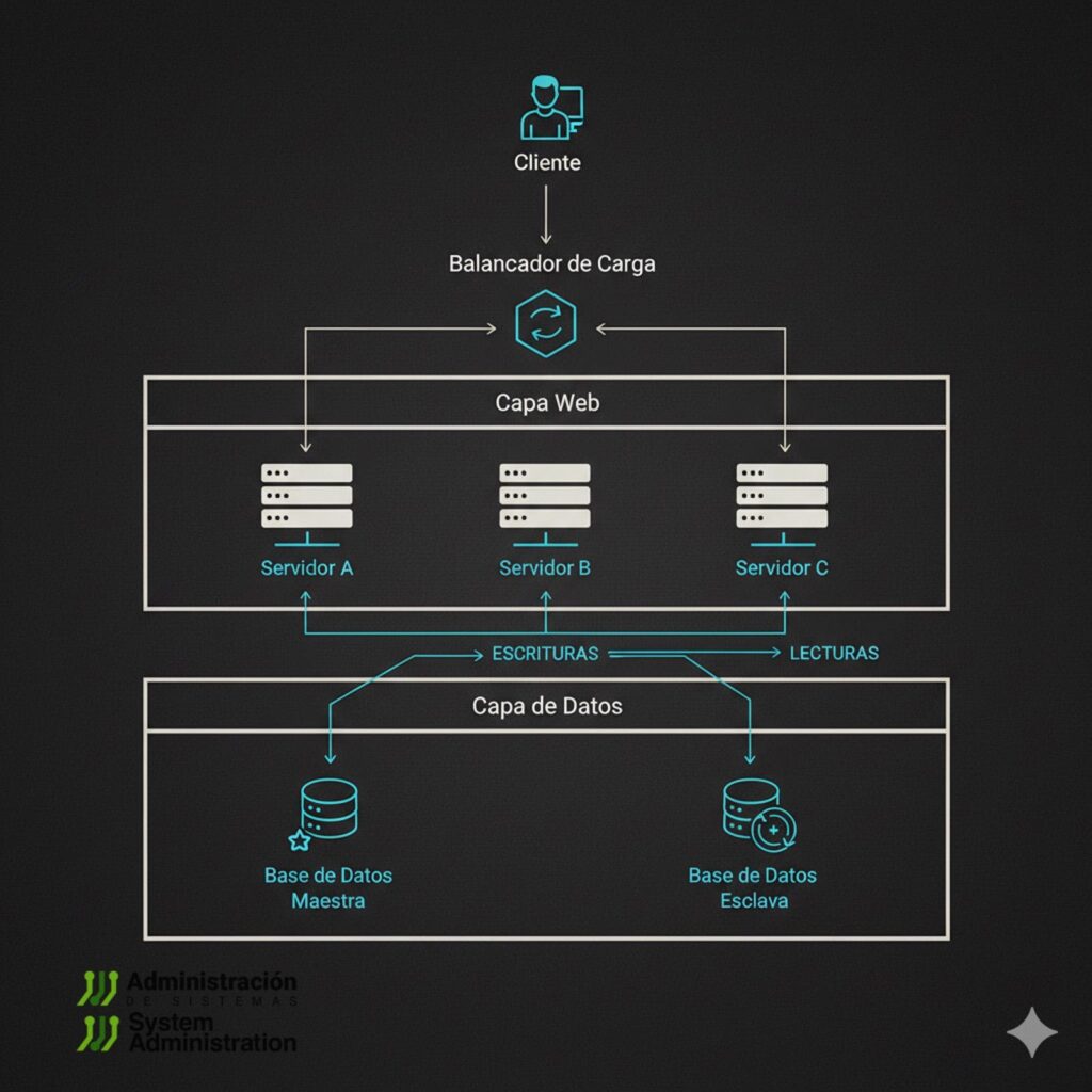 El diagrama típico (como el de arriba) resume el primer gran salto: un balanceador delante de varios servidores web (capa web) y una base de datos con réplicas (capa de datos). En este artículo repasamos cómo llegar ahí sin romper nada, qué decisiones tomar y qué errores evitar.