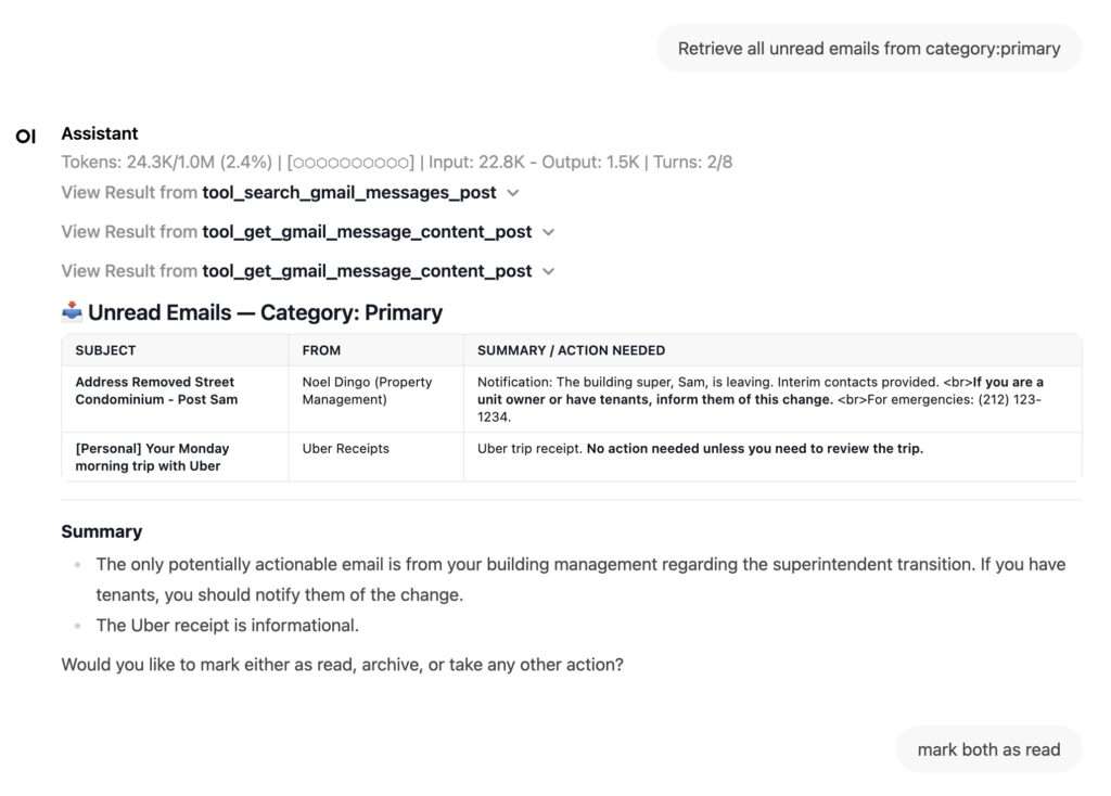 - Gmail: búsqueda de mensajes, lectura, redacción y envío de correos electrónicos