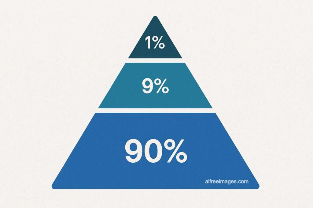 La regla del 90-9-1 establece que en cualquier comunidad online, aproximadamente el 90% de usuarios son lurkers (observadores pasivos), el 9% contribuye ocasionalmente, y solo el 1% genera la mayoría del contenido. Esta distribución no es arbitraria: refleja una manifestación digital de la ley de Zipf, donde la frecuencia de cualquier evento es inversamente proporcional a su rango en la tabla de frecuencias.