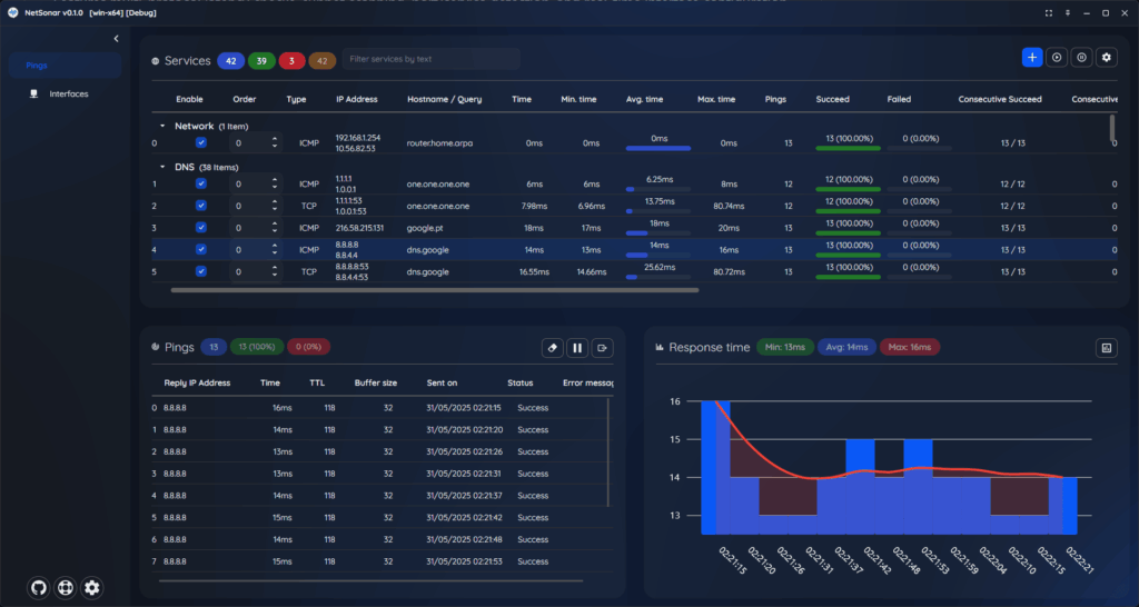 NetSonar es un proyecto open source diseñado para facilitar el análisis y la monitorización de redes de forma sencilla, visual y multiplataforma. Creado con .NET y una interfaz moderna basada en Avalonia y SukiUI, permite ejecutar pruebas de latencia, gestionar interfaces y descubrir servicios en la red local sin recurrir a soluciones más pesadas.