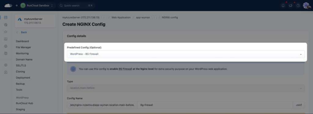 - En el desplegable Predefined Config, selecciona WordPress – 8G Firewall.
