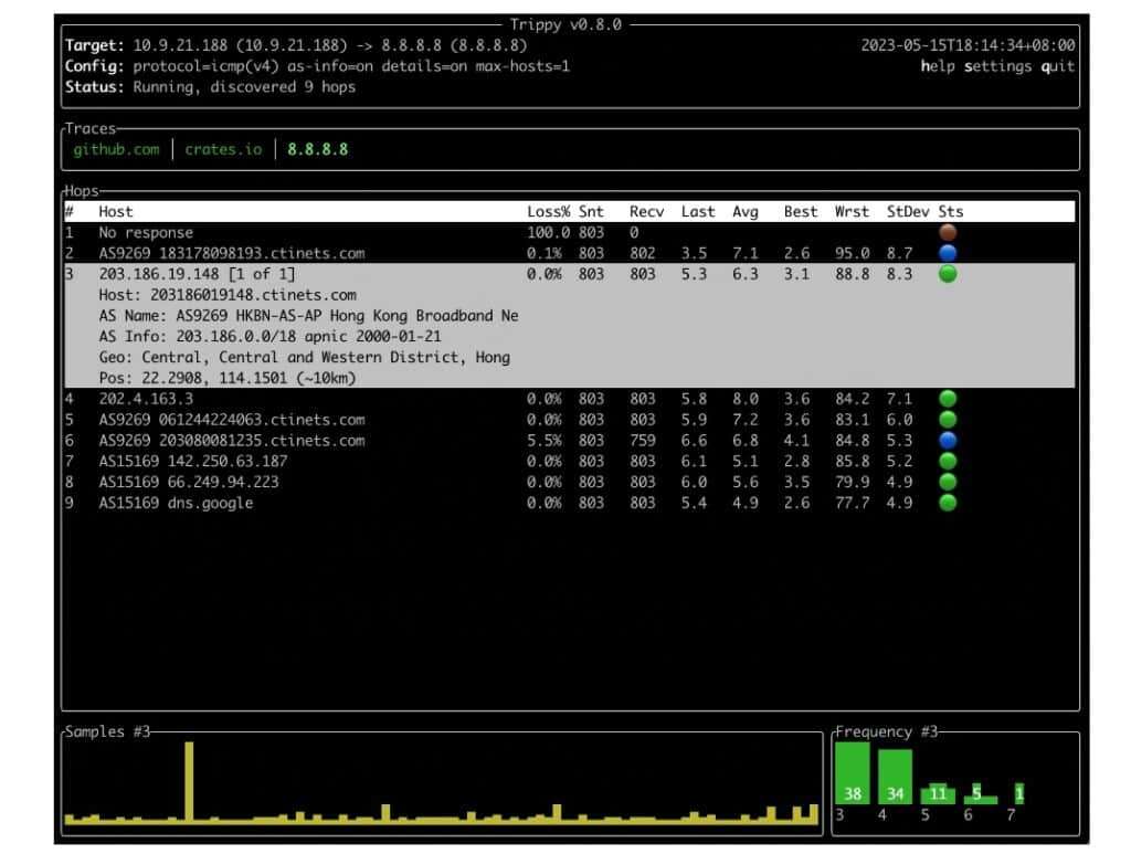 Trippy destaca por su capacidad para rastrear múltiples objetivos simultáneamente, analizar rutas en redes complejas y generar reportes detallados. Su compatibilidad con GeoIP y consultas DNS lo convierten en una herramienta imprescindible para los profesionales de redes.