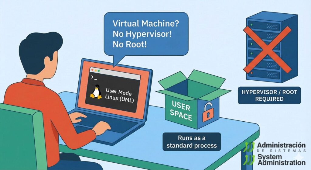 En cierto modo, UML ocupa un nicho muy particular entre contenedores y VMs: ofrece un kernel separado, pero sigue apoyándose en el kernel del sistema para muchas cosas. Es más una herramienta de laboratorio que una plataforma de virtualización generalista.