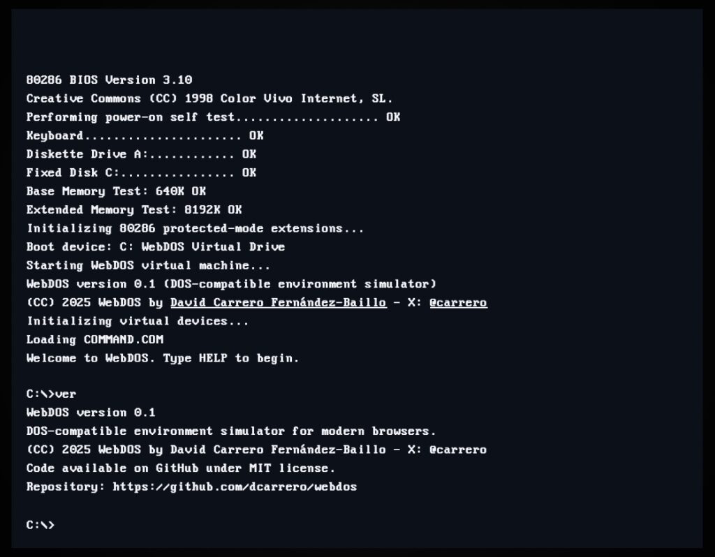 Nace WebDOS, un entorno DOS-like que corre directamente en el navegador y recrea la experiencia de un PC de finales de los 80 sin depender de la red. El proyecto —publicado por David Carrero Fernández-Baillo bajo licencia MIT— mezcla convenciones clásicas de línea de comandos con capacidades modernas del web runtime, construyendo un sandbox nostálgico para explorar interacciones retro por puro placer o con fines educativos.